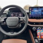 V strede palubnej dosky je 13-palcový displej infotainmentu, pred vodičom 10-palcový virtuálny kokpit a nechýba ani head-up displej. Smart Dials na fotkách vyzerajú ako nápad, ktorý mal najprv dobre vyzerať na prezentácii. V praxi však fungujú veľmi dobre. Rýchly prístup k základným funkciám bez zbytočného lovenia v menu je stále lepší nápad než ďalšia dotyková filozofia bez spätnej väzby. Superb sa konečne dočkal Matrix LED predných svetlometov a svietia fantasticky.